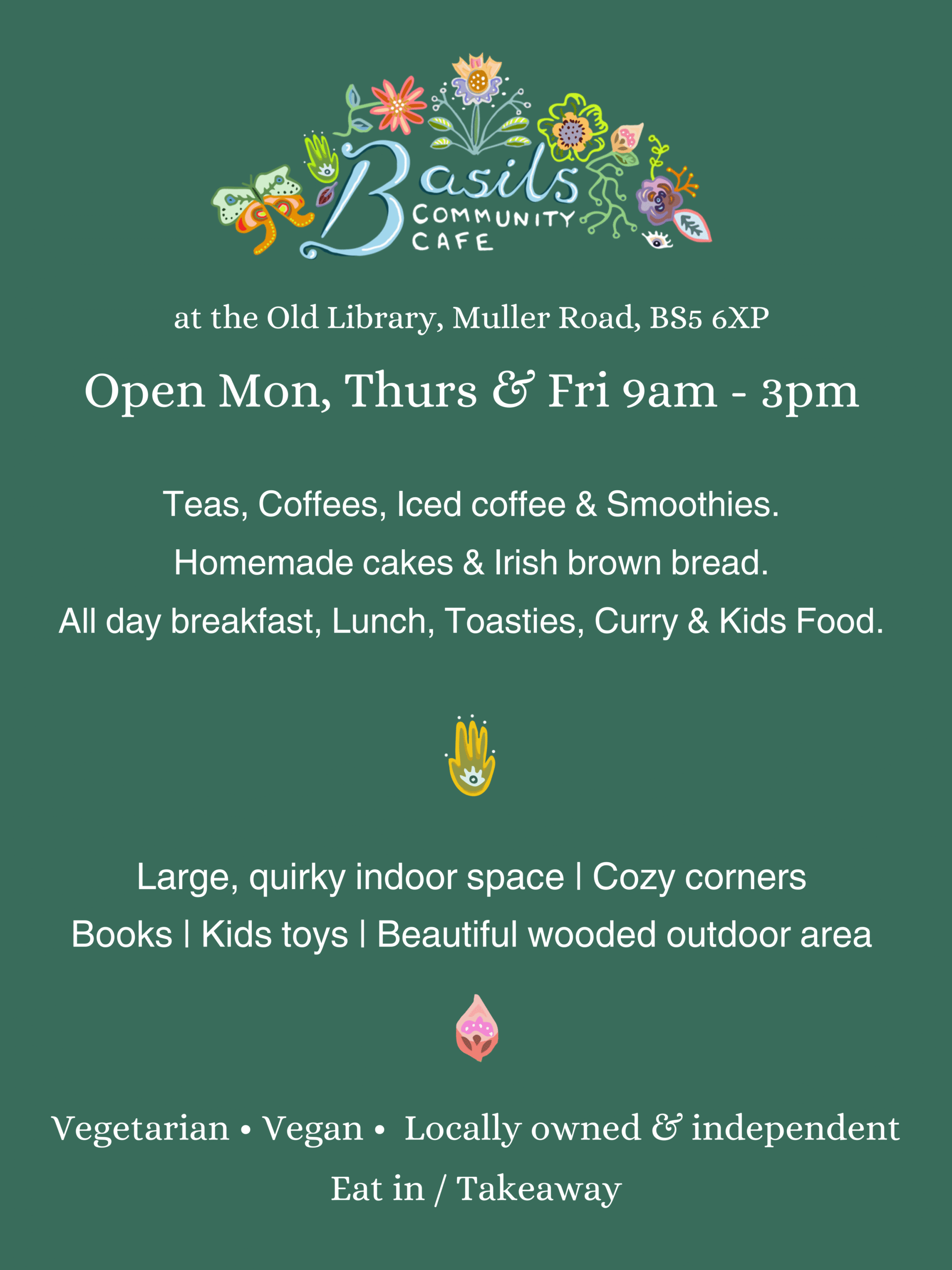 Community workshops & activities, community events, Basil’s community cafe open term time Monday, Thursday & Friday 9am – 3pm term time, library space, play area, hire room, kitchen and garden space.
